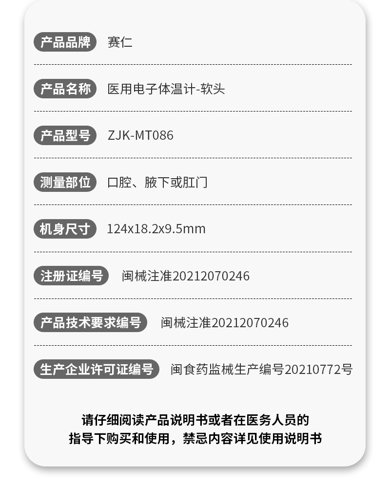 赛仁 医用电子体温计 ZJK-MT086 快速检测 测量精准 小巧便捷