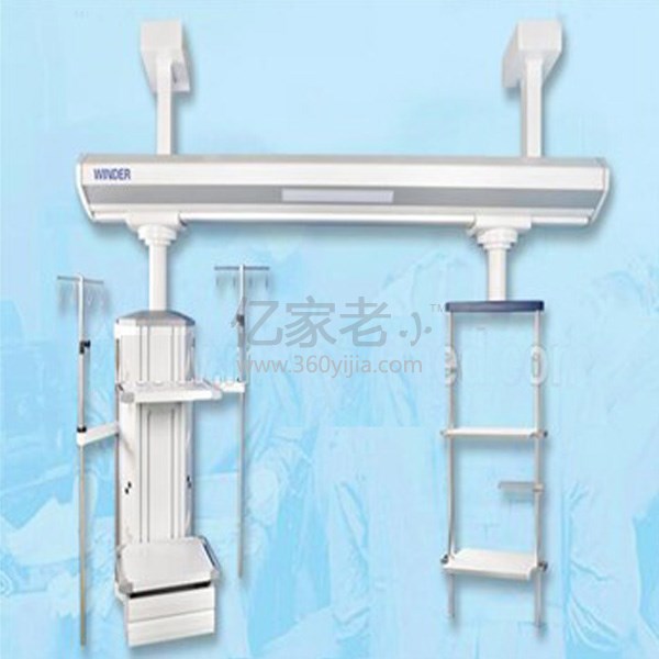 适用于医院ICU病房,是现代重症监护病房必备的医疗抢救辅助设备,主要由桥架、干段和湿段组成,其特点在于合理的干湿分两结构,湿区配置升降灵活的输液架。干湿区配置有可升降调节的仪器平台,在干湿区上分别配有氧气、空气、吸引、电源、网络输入终端、输液泵架。干湿区采用悬臂结构,提高了治疗空间,旋转部分来用制动刹车防飘移,摘梁中间配置有可旋转升降式照明治疗灯。主体材料采用高强度特殊铝合金型材及不锈钢,表面处理采用进口原料,高压静电喷塑,防紫外线、臭氧子。为临床治疗提供了照明解决方案,另外还可根据医院要求选配各类系统。