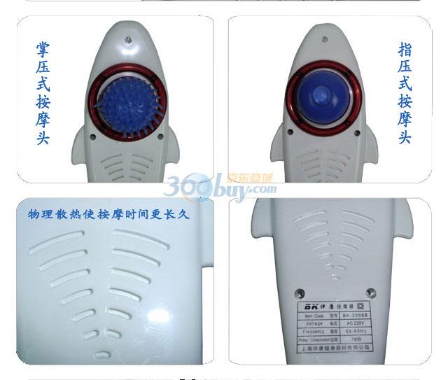 三、经过精心改良的按摩头,可装配各型按摩头,打破了传统按摩锤只可锤击的功能,增加了头部按摩和掌压按摩功能。共四个按摩头,配带在机子上的是一个外层为仿铝质材料的按摩头,另外还配有3个软体精致软按摩头,可根据身体多部位进行按摩头切换。