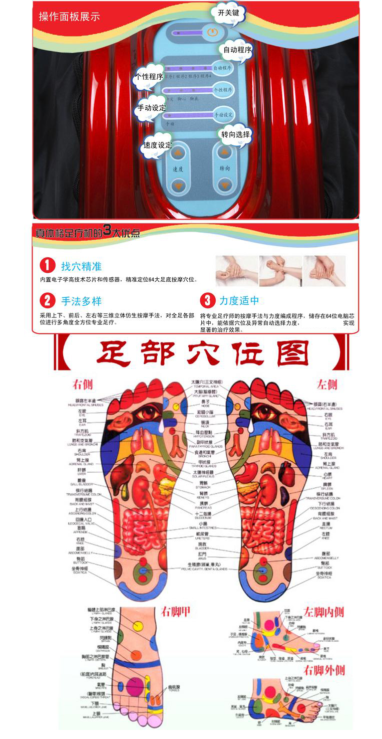 商品名称:真体格G-811-2 生产厂家:真体格 商品产地:中国大陆 商品毛重:8 足疗器的十大疗效: 1.防治神经衰弱、失眠 2.防治高血压、糖尿病 3.改善胃肠功能,防便秘 4.提高免疫,防感冒 5.防治颈肩腰酸痛 6.消除疲劳,解乏解累 7.改善前列腺功能 8.促进血液循环,提高防御能力 9.调节各肛腑器官的功能 10.镇静作用,疏经通络 ;