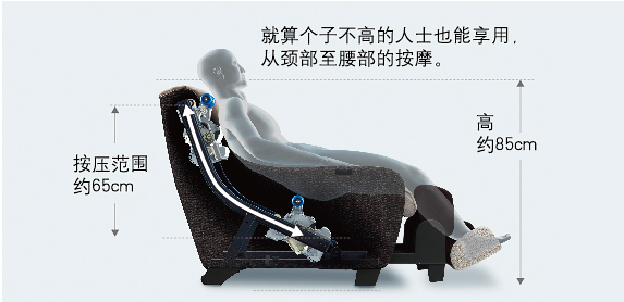 中央支架设计成沿着人体的坐姿来屈曲,座椅不需往后斜,便能以轻松的坐姿来享用按摩程序。宽阔的按压范围,从颈部至腰部覆盖。