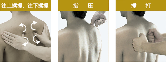 基本技法:4种:向上揉按、向下揉按、指压、敲打