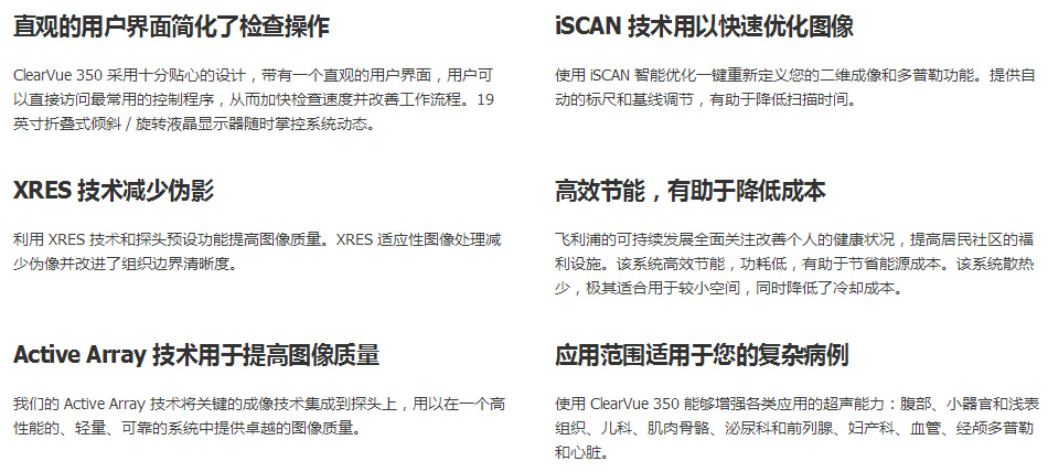 ClearVue 350 是名符其实的飞利浦优质成像系统,采用 Active Array 技术提供优质的图像质量,旨在提高诊断的准确性、简化复杂的功能,同时提高了易用性和可靠性。