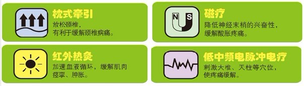 1.中低频电疗、红外、磁疗、枕式牵引同步治疗,直接作用于深层组织和骨骼。