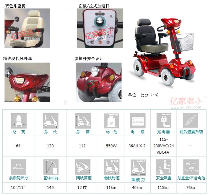 7、车宽64 cm、车长120 cm、前轮10”、后轮11”、马达500W、电瓶36AhX2、PG控制器、充电器4Amp