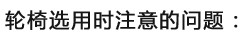 选用轮椅时重要的考虑因素是轮椅的尺寸。乘坐轮椅者承受体重的主要部位为臀部坐骨结节周围、股骨周围、帼窝周围和肩胛骨周围。轮椅的尺寸,特别是轮椅座位宽窄、轮椅座位深浅与轮椅靠背的高度以及轮椅脚踏板到轮椅座垫的距离是否合适,都会使乘轮椅者有关着力部位的血液循环受影响,并发生皮肤摩损,甚至压疮。此外,还要考虑患者的性、操作能力、轮椅的重量、轮椅使用地点、轮椅外观等问题。