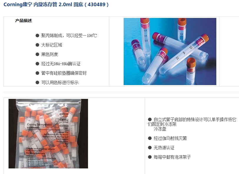 Corning康宁 内旋冻存管 2.0ml 圆底(430489)