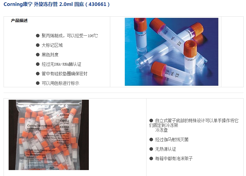 Corning康宁 外旋冻存管 2.0ml 圆底(430661)