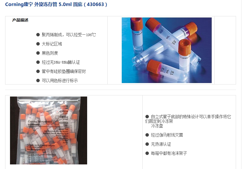 Corning康宁 外旋冻存管 5.0ml 圆底(430663)
