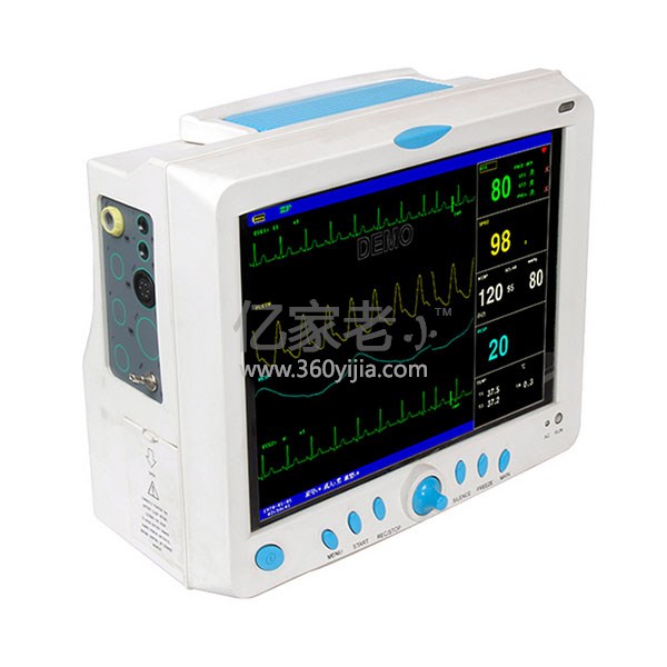 本监护仪可监护心电(ECG)、呼吸(RESP)、血氧(SpO2)、脉率(PR)、无创血压(NIBP)、双通道体温(TEMP)等主要参数。它把参数测量模块功能、显示和记录输出集于一体,构成一款结构紧凑、轻便的监护仪。它的可更换式内置电池为病人移动提供了方便。