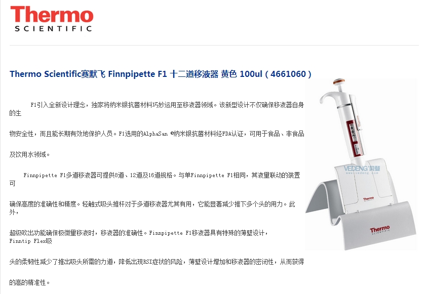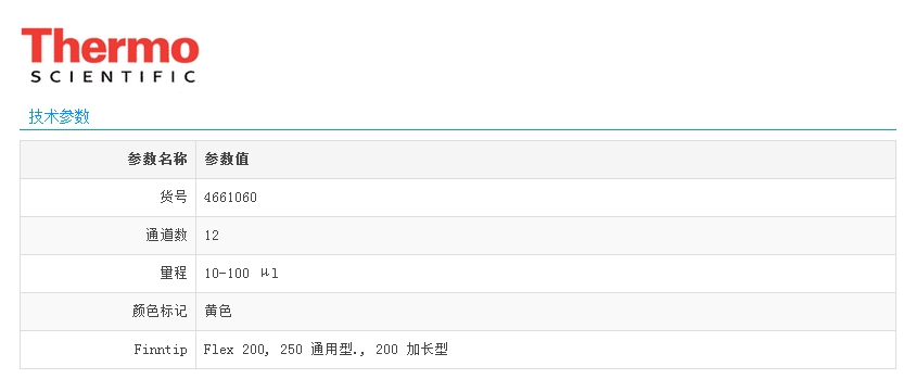 Thermo Scientific赛默飞 Finnpipette F1 十二道移液器 黄色 100ul (4661060)