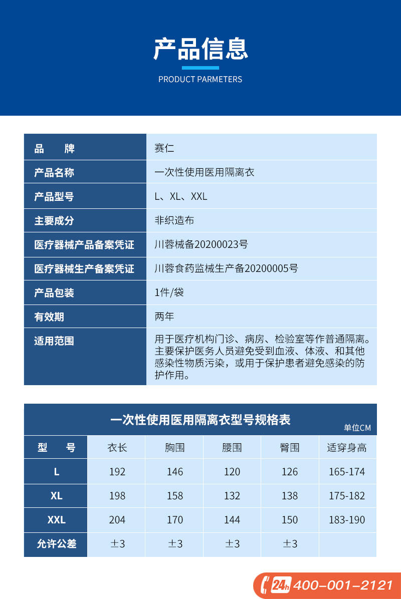 赛仁 一次性医用隔离衣 连身式 L(165-174cm)