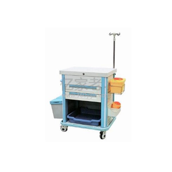 基本配置:台面为两侧平拉开(可锁),内侧空间500x310x110mm,配活动分隔档。上部两抽屉,下部配置物盆。防撞圈、钢塑柱、静音脚轮、可卸式储物盒、单支输液架、除颤板、垃圾桶。