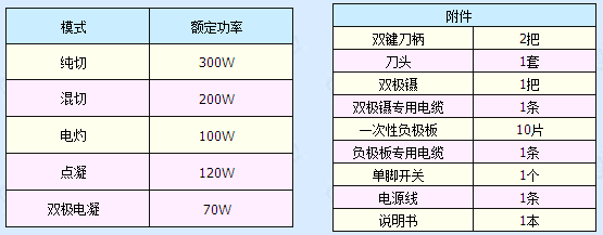 具有纯切、混切、电灼、电凝、双极电凝、五种工作模式;