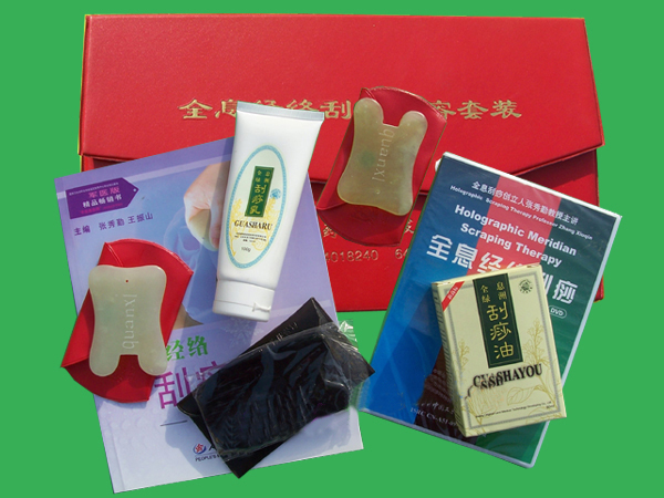 全息经络刮痧美容书1本、中英文VCD教学光盘2片、面部刮痧玉板2片、牛角刮痧板梳1片、刮痧油1瓶、刮痧乳1支。