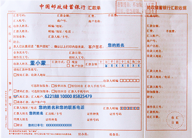 (3)如您未注明订单号,请您汇款后将汇款凭证(注明订单号)扫描以附件形式发邮件至151619620@qq.com,以便我们核实您的款项。若没有接到您的汇款凭证,您的订单将无法处理。