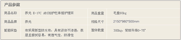 【商品名称】:养光护理床E-17C 【商品品牌】:养光 【商品产地】:河北 【商品规格】:2150*980*500mm 【商品毛重】:100公斤