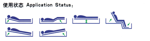 ● 可用手持开关任意调节背部上升角度(80度)和腿部下降角度(100度), 脚部床面处离地面290mm,可升高床面不同高度。