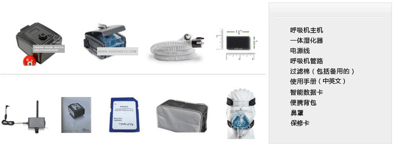 商品包含:主机+湿化器+面罩+管路+电源线+备用过滤棉+SD卡+背包+说明书