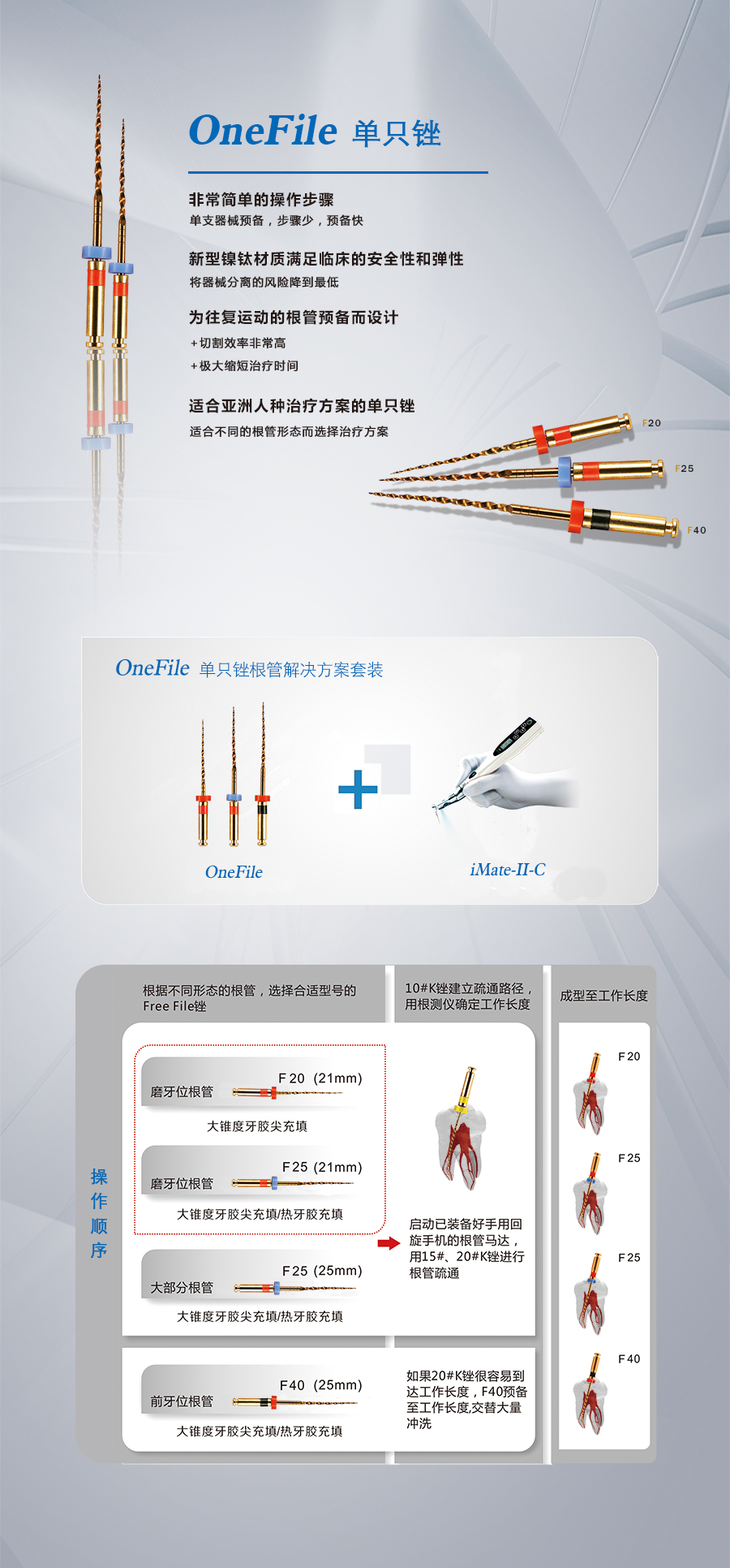 公司与国内牙科专家紧密合作,以中国大陆地区病人的根管特点为基础,形成了适合中国人根管特点的治疗理念。依据此治疗理念,不断推出新的操作系统和开发新产品,从而简化,改善和提高牙医的工作。得悦是口腔内科器专业生产商和服务商,我们不断在追求用户体验而努力!满足牙科医生的需求和愿望是我们的使命! 我们的核心产品主要有:电子根尖测定仪,根管治疗仪,i3 gold、one file、Free file 等镍钛根管系统,热熔牙胶充填系统,放大镜,口腔显微镜等。