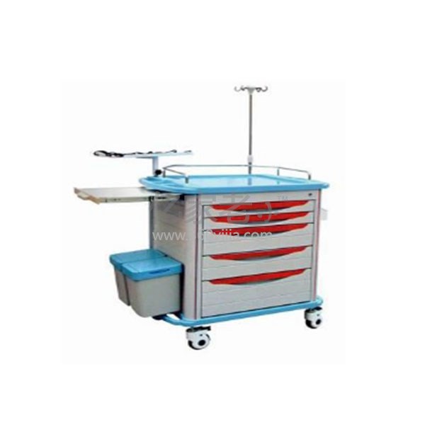 基本配置:ABS工作台面(内嵌保护软玻璃),一体化把手设计,不锈钢护栏,输液架、储物盒、除颤板、双污物桶、中控锁、Φ5' 静音脚轮。