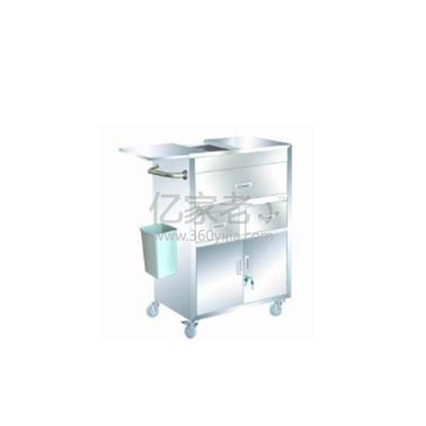 4个万向脚轮,对角刹车。顶部两翻盖,有针剂抽屉,带抢救版和污物桶。