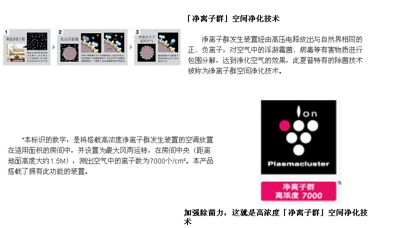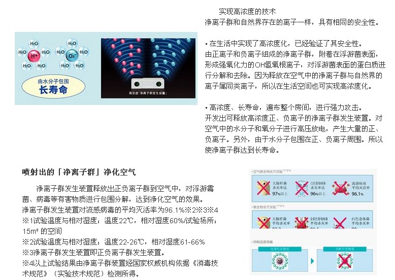 实现高浓度的技术 净离子群和自然界存在的离子一样,具有相同的性。 喷射出的「净离子群」净化空气 净离子群发生装置释放出正负离子群到空气中,对浮游霉菌、病毒等有害物质进行包围分解,达到净化空气的效果。 HEPA 滤网 卓越的集尘效果,消除室内灰尘,强效净化,过滤室内空气。 甲醛祛除滤网 采用甲醛祛除滤网有效祛除甲醛,为您创造清新纯净的室内空间。甲醛祛除率96%。 可清洗脱臭滤网 可以反复清洗使用的脱臭滤网 适用面积:31㎡ |