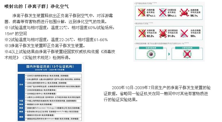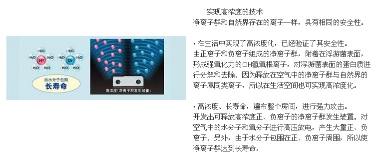实现高浓度的技术 净离子群和自然界存在的离子一样,具有相同的性。 在生活空间中实现了高浓度化,已经验证了其性。 高浓度、长寿命,遍布整个房间,进行强力攻击。 喷射出的「净离子群」净化空气 离子发生器释放出正负离子群到空气中,对浮游霉菌、病毒等有害物质进行包围分解,达到净化空气的效果。 使用面积:28㎡ |