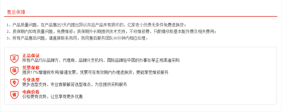 注: 产品质量问题,在产品售出7天内提出异议并且产品未有损坏的,亿家老小负责无条件免费退换货;质保期内如有质量问题,免费维修;质保期外长期提供技术支 持,不收维修费,只酌情收取基本配件费及相关费用;所有产品售后问题,请直接联系我司(7x24小时热线:400-027-9875),我司售后服务团队 30分钟内相应处理。