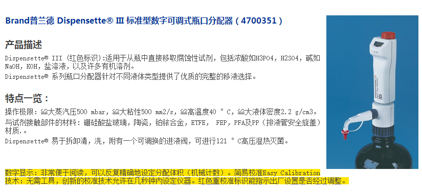 Brand普兰德 Dispensette III 标准型数字可调式瓶口分配器 2,5-25ml (4700351)