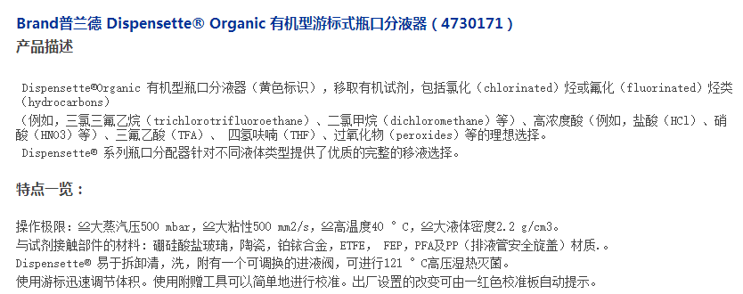 Brand普兰德 Dispensette Organic 有机型游标式瓶口分液器10 -100ml(4730171)