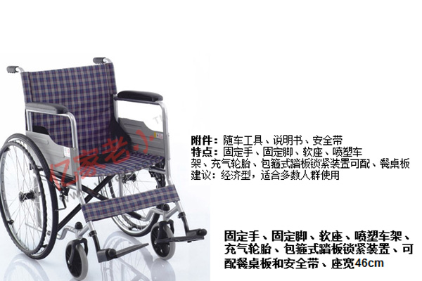固定手、固定脚、软座、喷塑车架、充气轮胎、包箍式踏板锁紧装置、可配餐桌板和带、座宽46cm