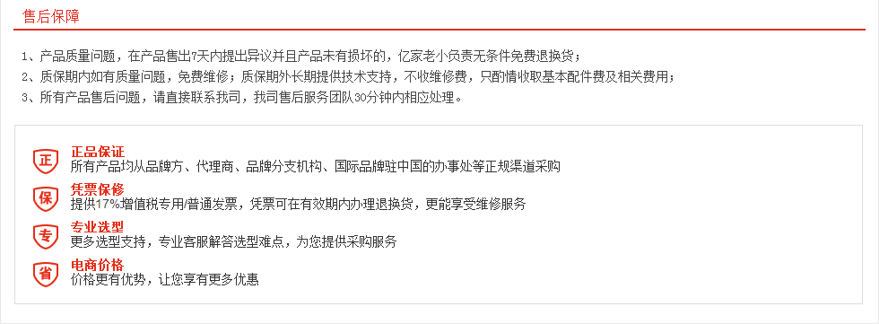 注: 产品质量问题,在产品售出7天内提出异议并且产品未有损坏的,亿家老小负责无条件免费退换货;质保期内如有质量问题,免费维修;质保期外长期提供技术支 持,不收维修费,只酌情收取基本配件费及相关费用;所有产品售后问题,请直接联系我司(7x24小时热线:400-027-9875),我司售后服务团队 30分钟内相应处理。