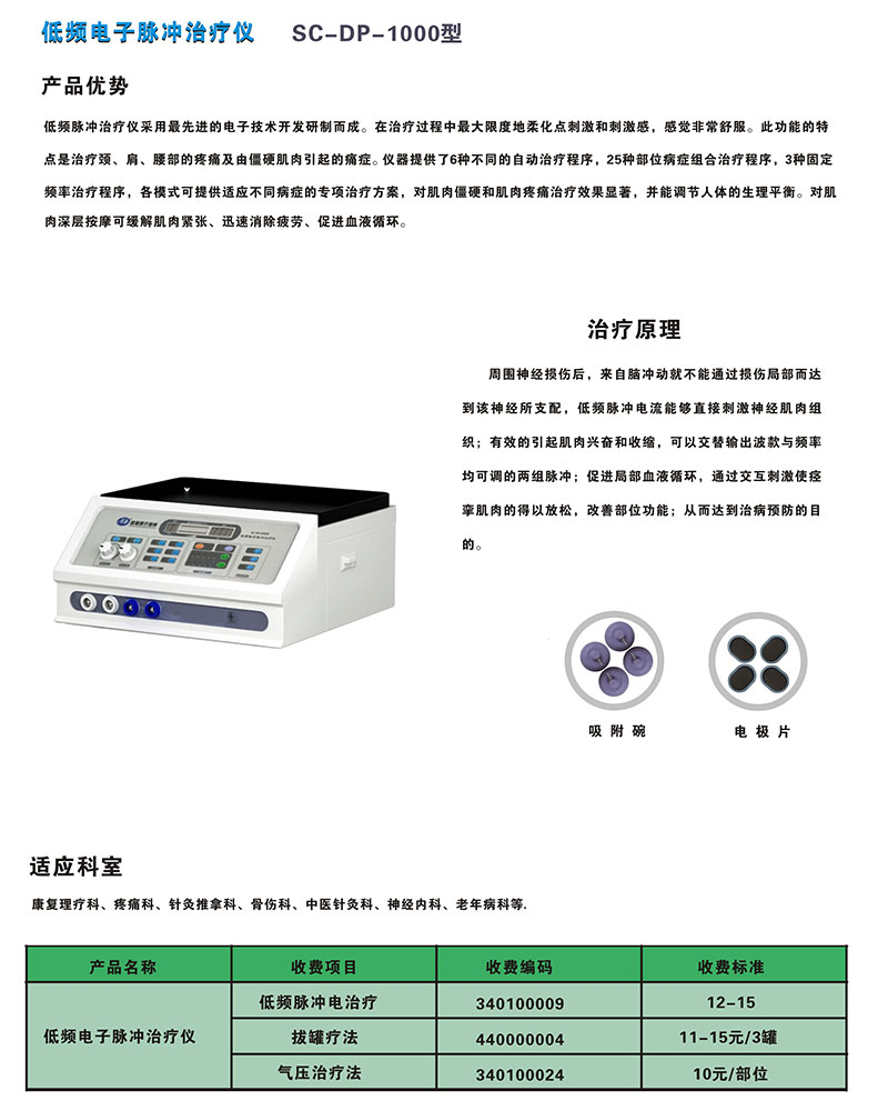 低频电子脉冲治疗仪 采用的电子技术开发研制而成。在治疗过程中限度地柔化电刺激的刺激感,感觉非常舒服。此功能的特点是治疗颈、肩、腰部的疼痛及由僵硬肌肉引起的痛症。 仪器提供了5种不同的自动治疗程序,16种不同的手动治疗程序 。