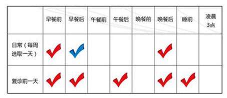 复诊前一天:监测5点血糖,分别是早餐前、早餐后、午餐后晚餐后和睡前