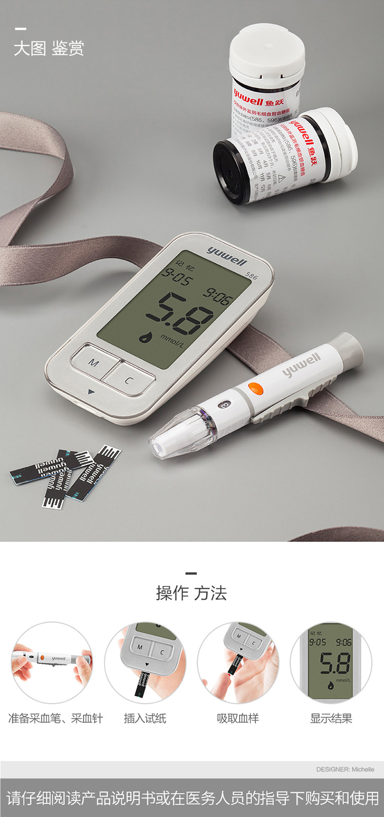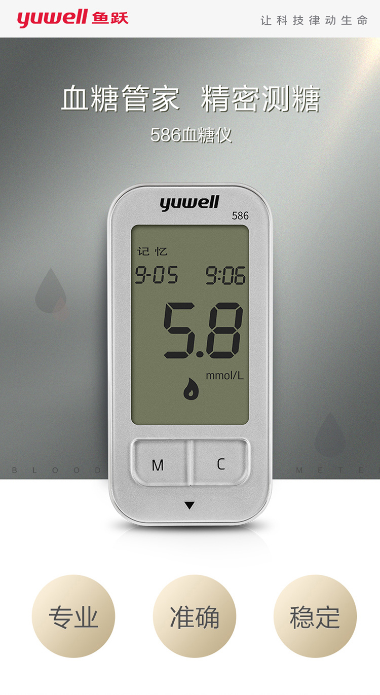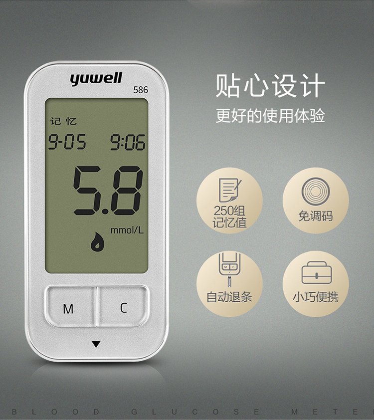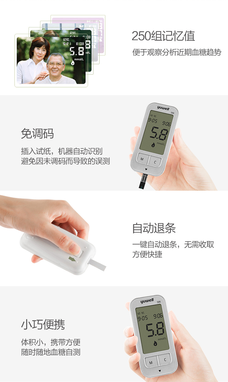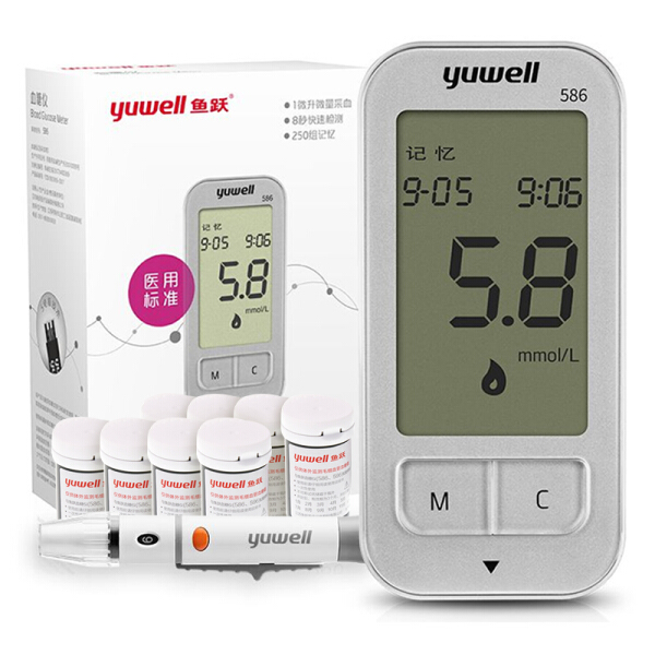 鱼跃 血糖仪586型套装(含200片试纸/采血针)智能免调码