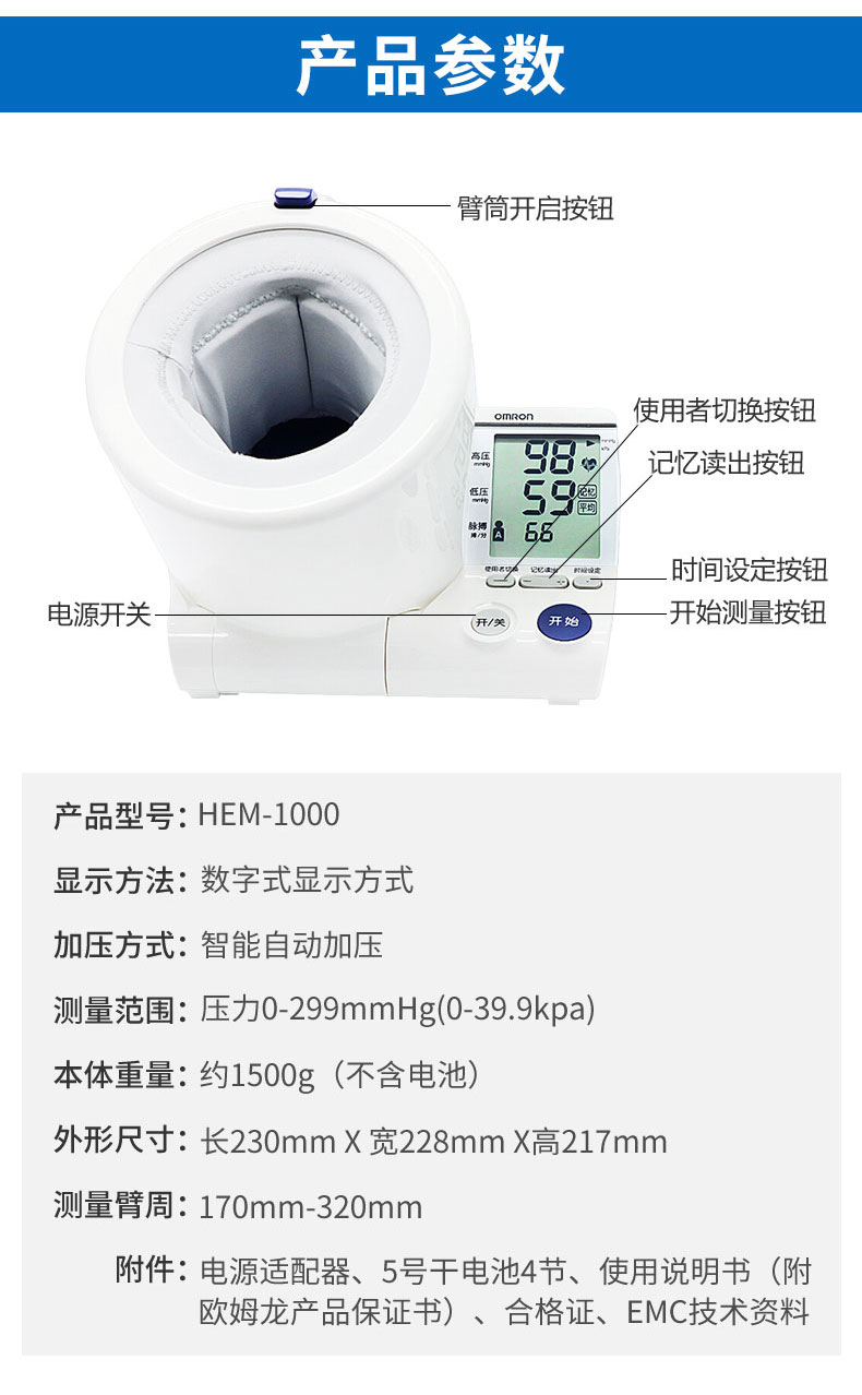 欧姆龙 电子血压计(臂筒式) HEM-1000 全自动智能加压
