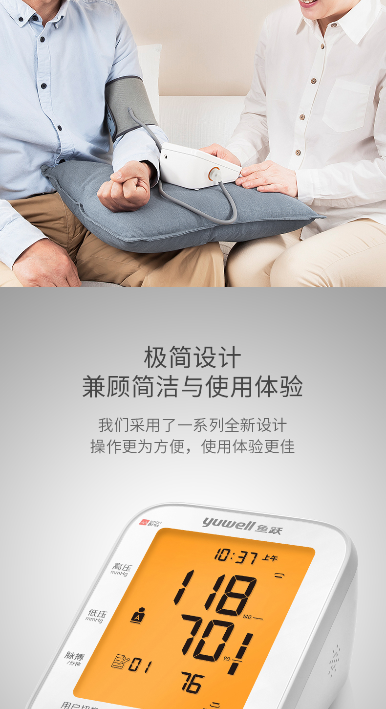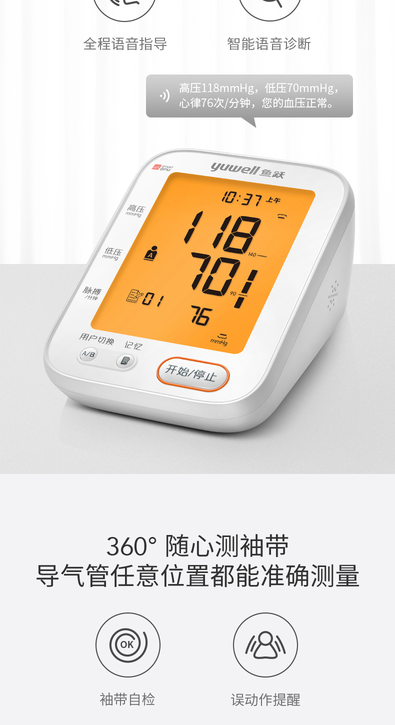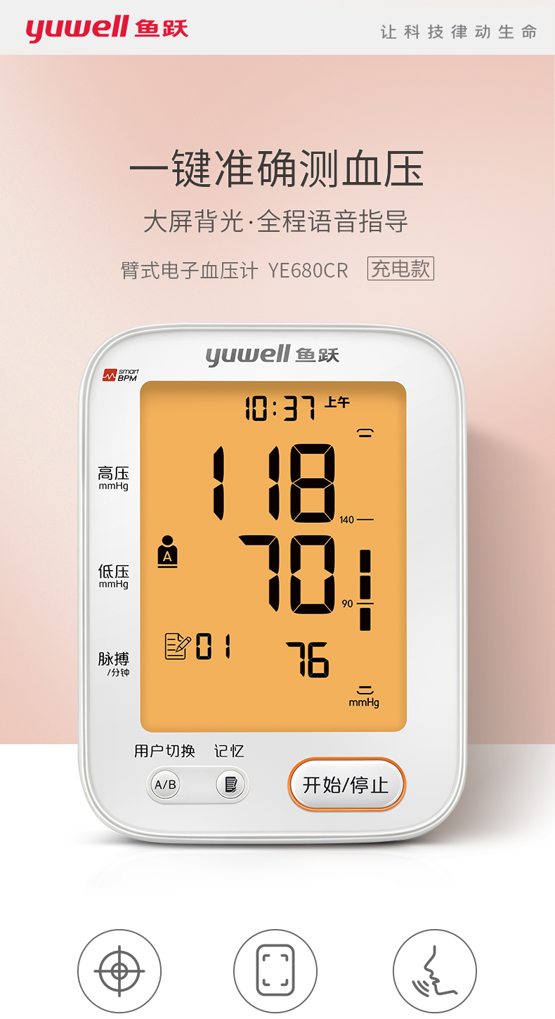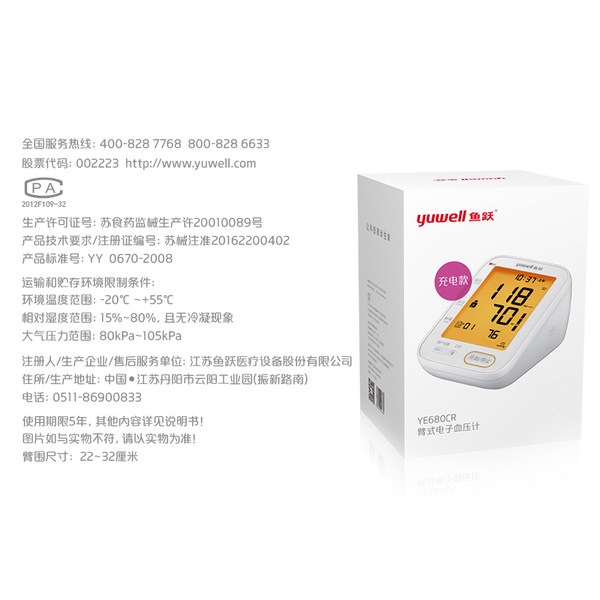 鱼跃 YUWELL 家用全自动电子血压计(上臂式)YE680CR