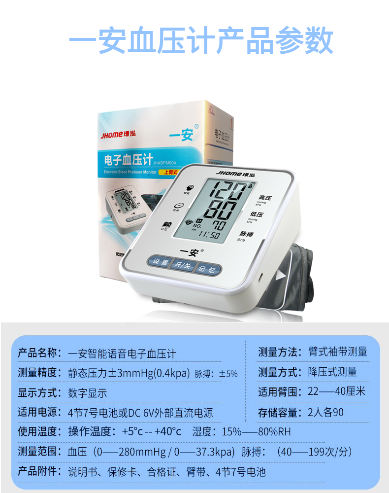 一安 家用全自动高精准电子血压计(上臂式)JHABPM004