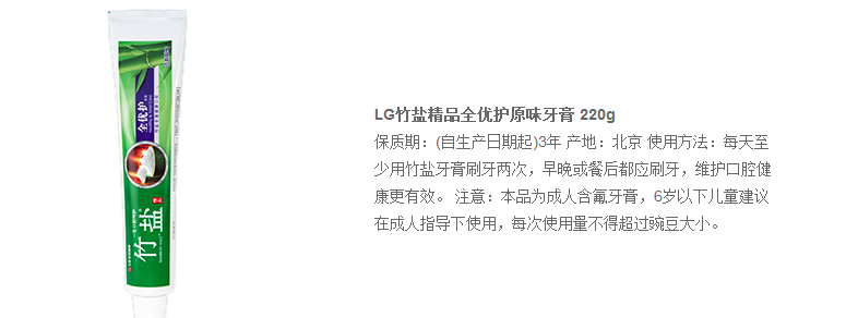 LG竹盐 全优护原味 牙膏 (精炼竹盐 全优呵护)(新老包装随机发送) 220g