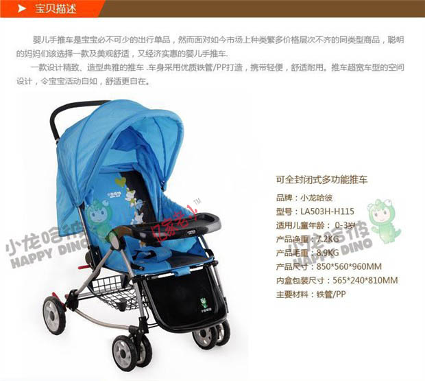 小龙哈彼LA503H设计精致,造型经典的手推车,赠送精美蚊帐,全封闭车棚,更合乎宝宝的。