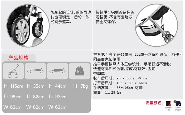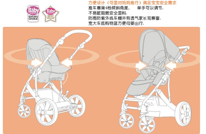 1、方便设计(可面对妈妈推行)满足宝宝需求。 2、推车靠背4档倾斜角度,单手可以调节. 3、不易脏阻燃面料. 4、防雨防紫外线车棚并有透气家长观察窗. 5、宽大车底购物篮方便母婴出行. 6、易收回把手,锁快速折叠收起推车 7、推车打开并可以自动锁定 8、可调节5点式带, 配有加厚舒适衬层,儿童乘坐更 9、防刺轮胎设计,前轮可旋转也可锁定. 后轮一体式同步煞车. 10、超轻便全铝框架结构美观轻便.不含有害烤漆,又环保. 11、符合严格的英国BS7409童车标准及欧盟BS/EN1888儿童推车标准并已经12、通过中国童车标准GB14748-1993的检测. 更享有百代适的质量保证. |