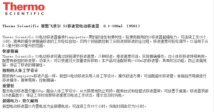 Thermo Scientific 赛默飞世尔 S1移液管电动移液器 0.1-100ml (9501)