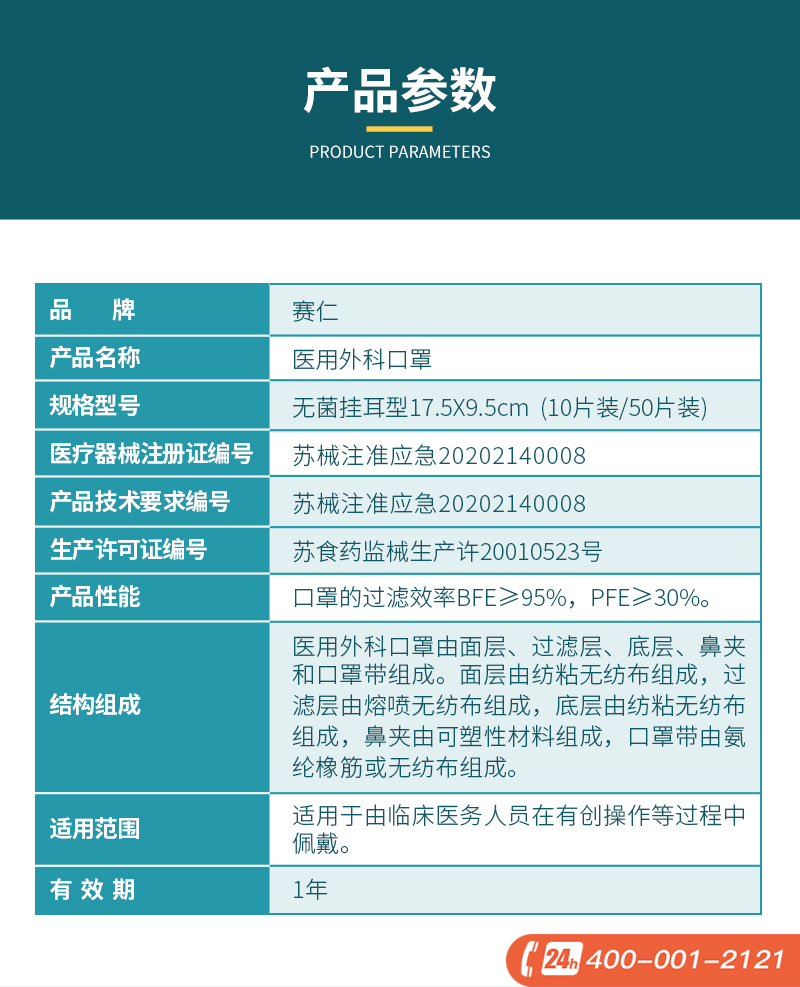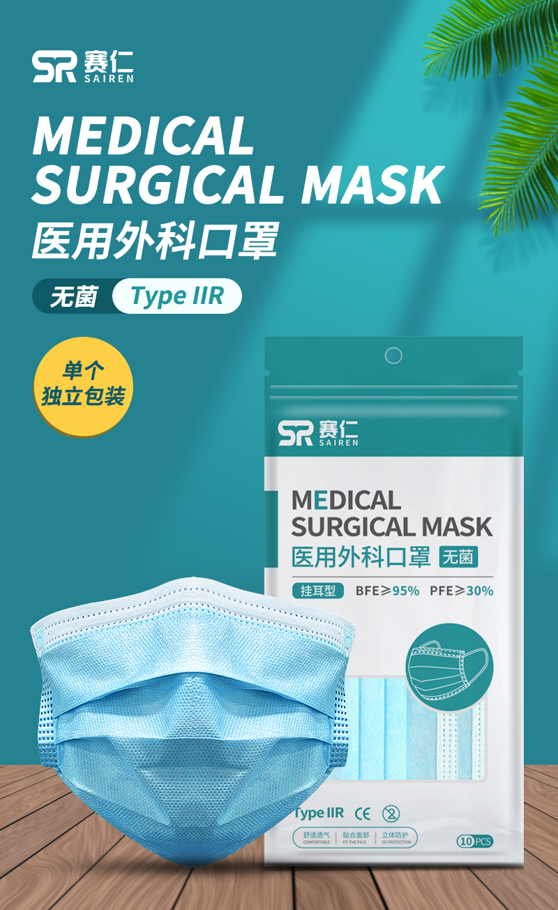 赛仁 医用外科口罩 无菌型(蓝色) 独立包装 50片装/盒