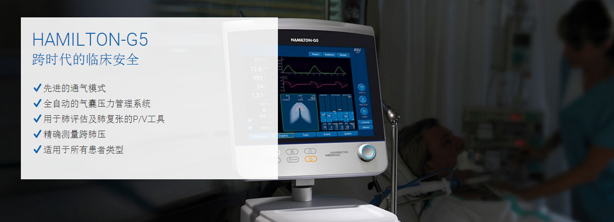 除具有许多其它特点外,HAMILTON-G5 还配备了 Hamilton Medical 瑞士哈美顿医疗公司的标准化通气酷屏用户界面和独特的智能通气模式“适应性支持通气 (ASV®)”。