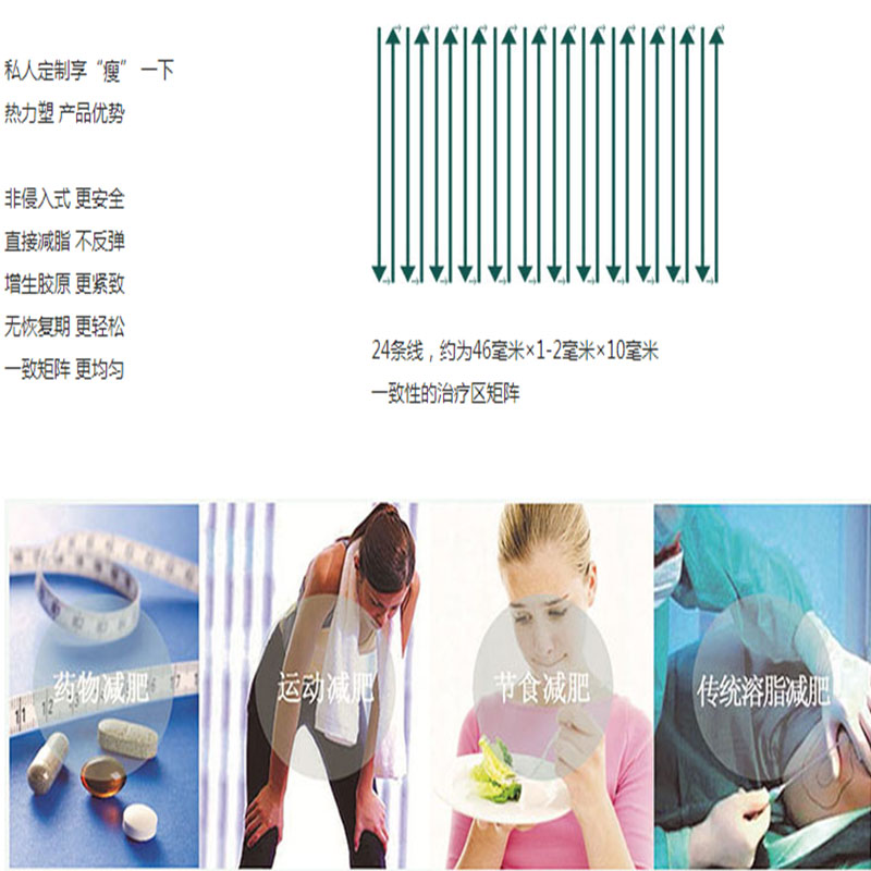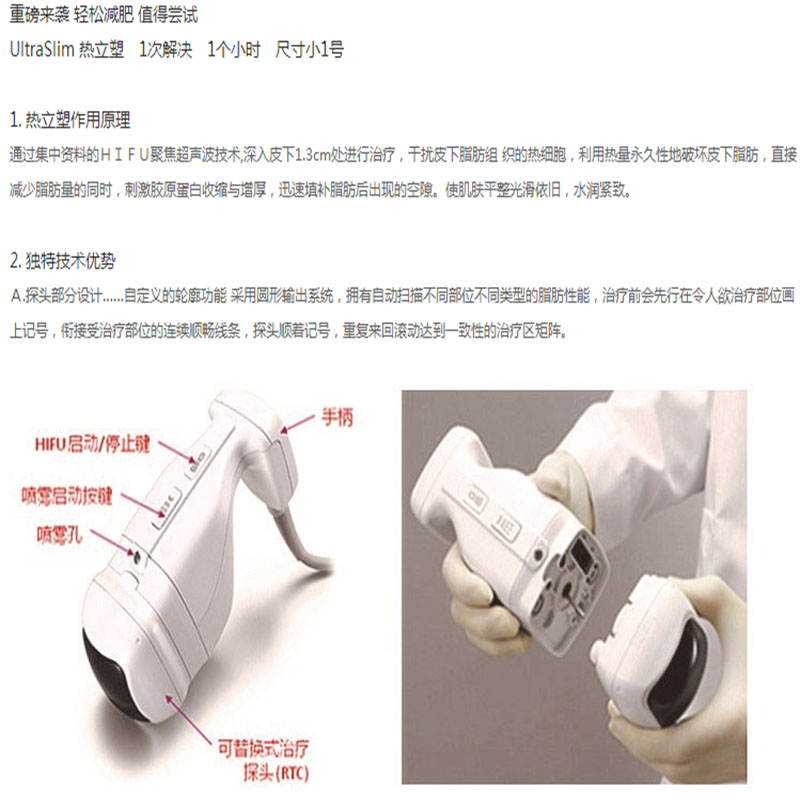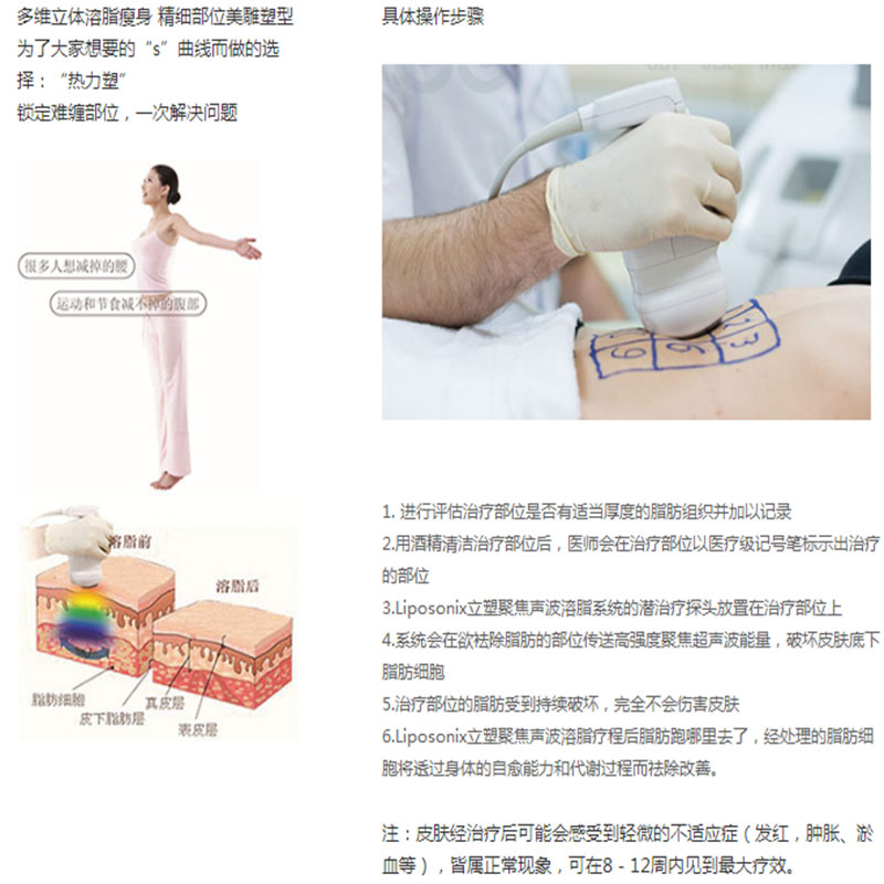 去脂瘦身:提供统一集中的超声能量,深入皮下1.3cm处进行治疗,破坏及去除皮下脂 肪组织。 紧实润滑肌肤:热能机制同时刺激皮下组织层的蛋白收缩及增生。迅速填补消融脂肪后出现的空隙,使肌肤平整光滑依旧。