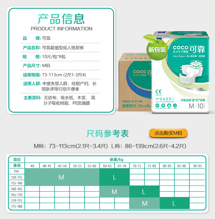 可靠 成人纸尿裤M号10片*8包【73-113cm】
