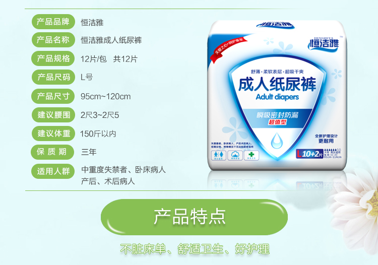 恒洁雅 成人纸尿裤 L12片 (81*114cm) 12片*1包