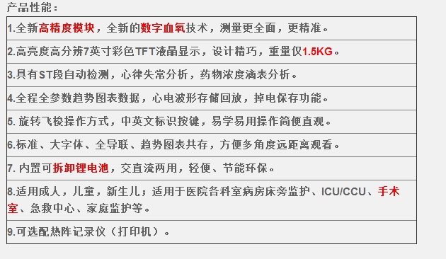 道热敏打印机一台、标准五导心电导联连接电缆一套、标准成人血压袖带一套、血氧
