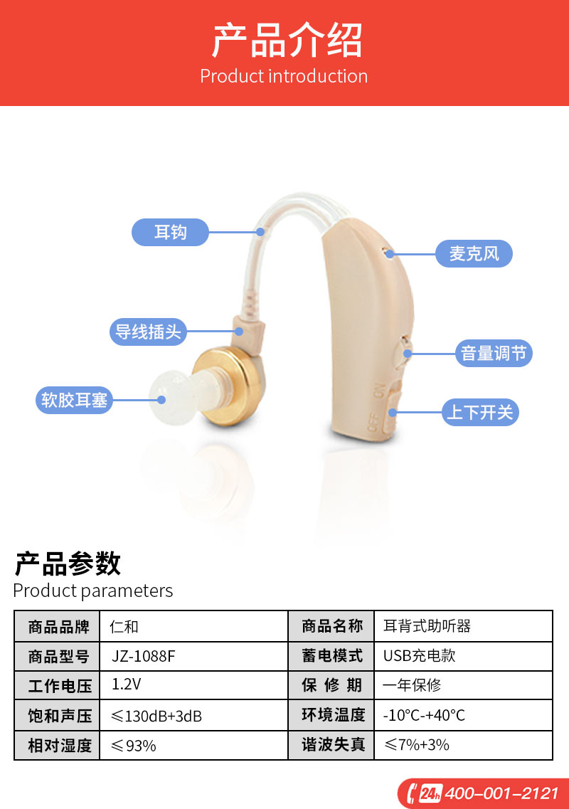 仁和 耳背式助听器 JZ-1088F5双耳充电